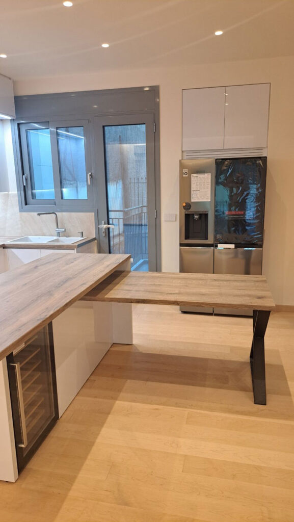 Η νησίδα σχεδιάστηκε με πολυλειτουργικό χαρακτήρα και ενσωματώνει πτυσσόμενο τραπέζι και αποθηκευτικό χώρο, προσφέροντας ευελιξία στην καθημερινή χρήση.