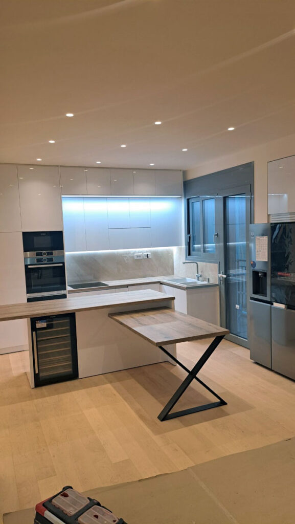 Ιδιαίτερη έμφαση δόθηκε στον φωτισμό, με κρυφό γραμμικό LED κάτω από τα επάνω ντουλάπια, ώστε ο πάγκος εργασίας να είναι σωστά φωτισμένος και το αποτέλεσμα πιο σύγχρονο.