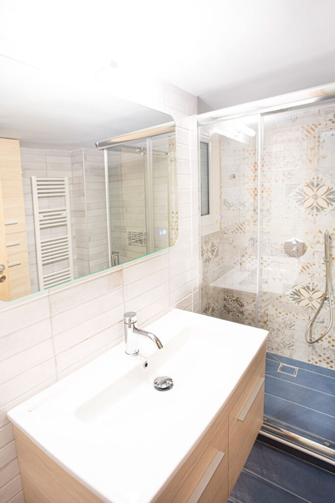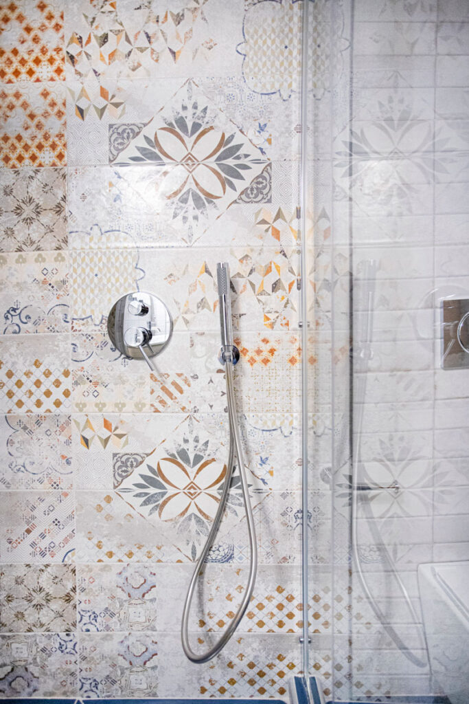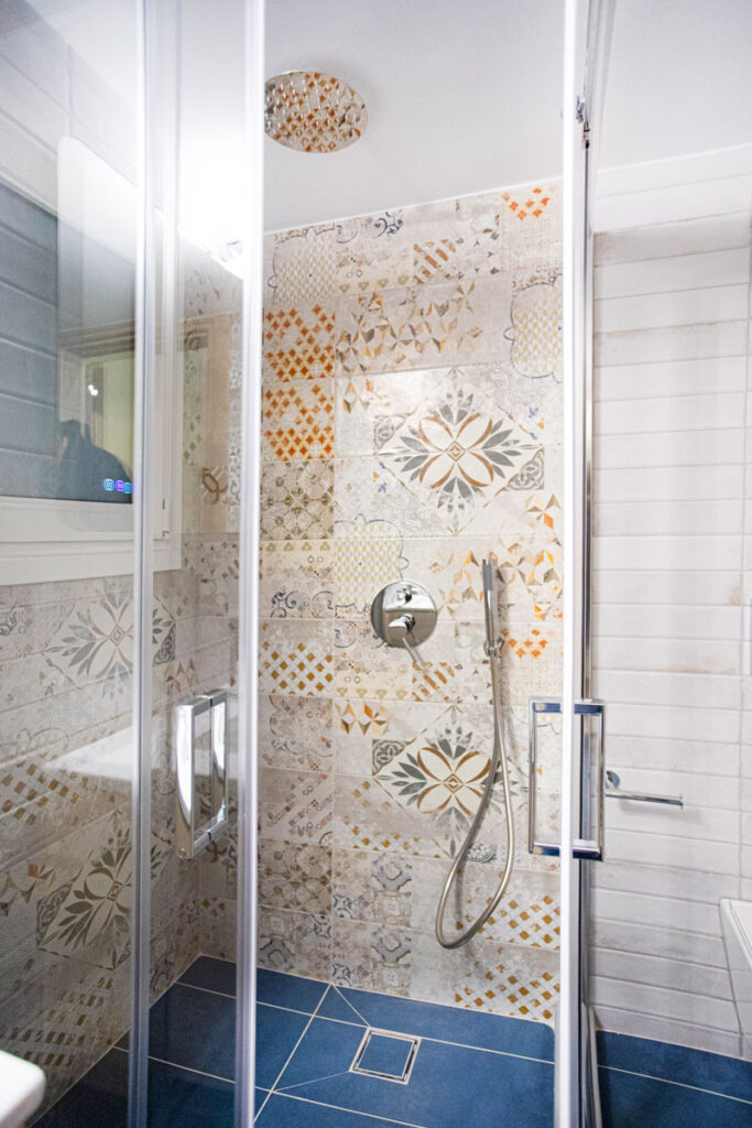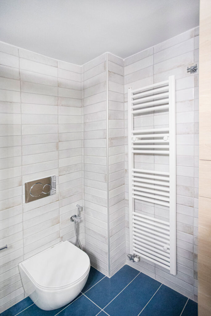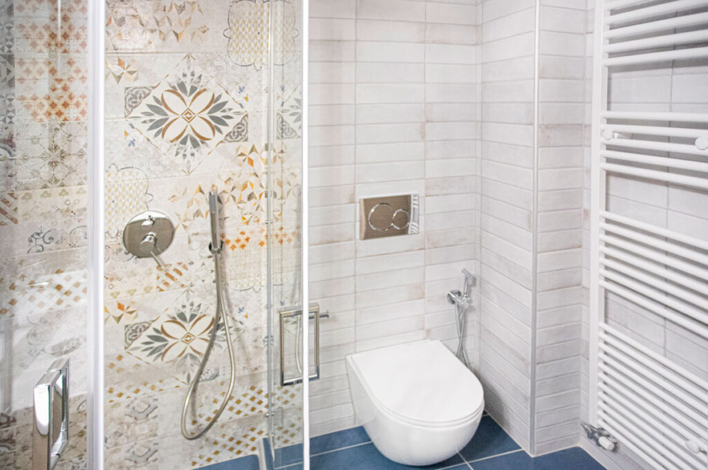 Τα λευκά πλακάκια σε οριζόντια διάταξη ενισχύουν την αίσθηση καθαρότητας και οπτικής διεύρυνσης του χώρου, ενώ ο διακοσμητικός τοίχος μέσα στη ντουζιέρα προσθέτει έντονο χαρακτήρα και αισθητική ταυτότητα. Η επιλογή μπλε δαπέδου δημιουργεί μια κομψή αντίθεση, προσδίδοντας βάθος και σύγχρονη δυναμική.