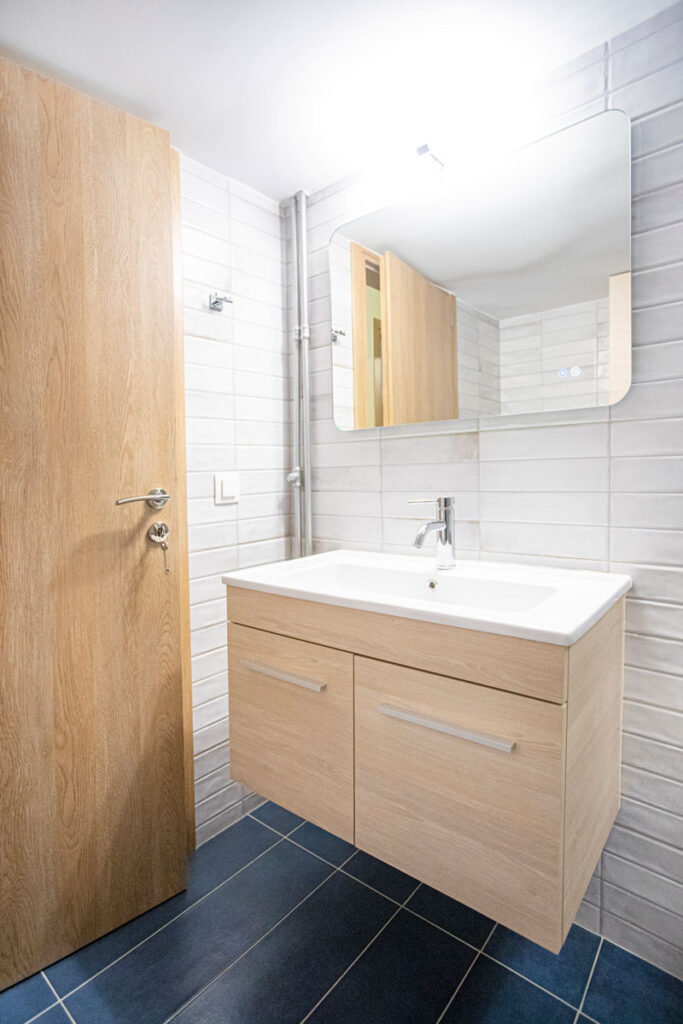 Η γυάλινη καμπίνα ντους εξασφαλίζει λειτουργικότητα και άνεση, χωρίς να «βαραίνει» οπτικά τον χώρο. Η κρεμαστή λεκάνη με εντοιχισμένο καζανάκι ενισχύει τον minimal σχεδιασμό και διευκολύνει τον καθαρισμό, ενώ το έπιπλο μπάνιου σε φυσική απόχρωση ξύλου προσθέτει ζεστασιά και αποθηκευτική πρακτικότητα.
