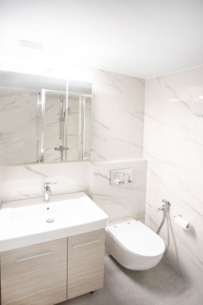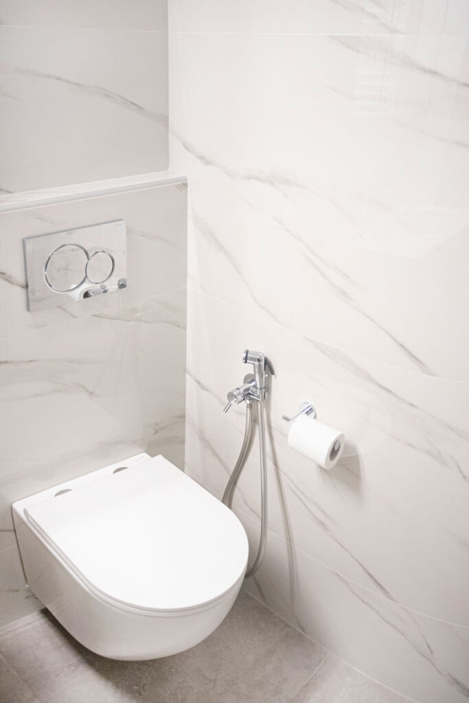 Η κρεμαστή λεκάνη με εντοιχισμένο καζανάκι ενισχύει τον minimal χαρακτήρα, ενώ το ντουζάκι υγιεινής προσθέτει πρακτικότητα στην καθημερινή χρήση. Το έπιπλο μπάνιου σε φυσική απόχρωση ξύλου δίνει ζεστασιά στον χώρο, δημιουργώντας αντίθεση με τις λευκές και γυαλιστερές επιφάνειες.