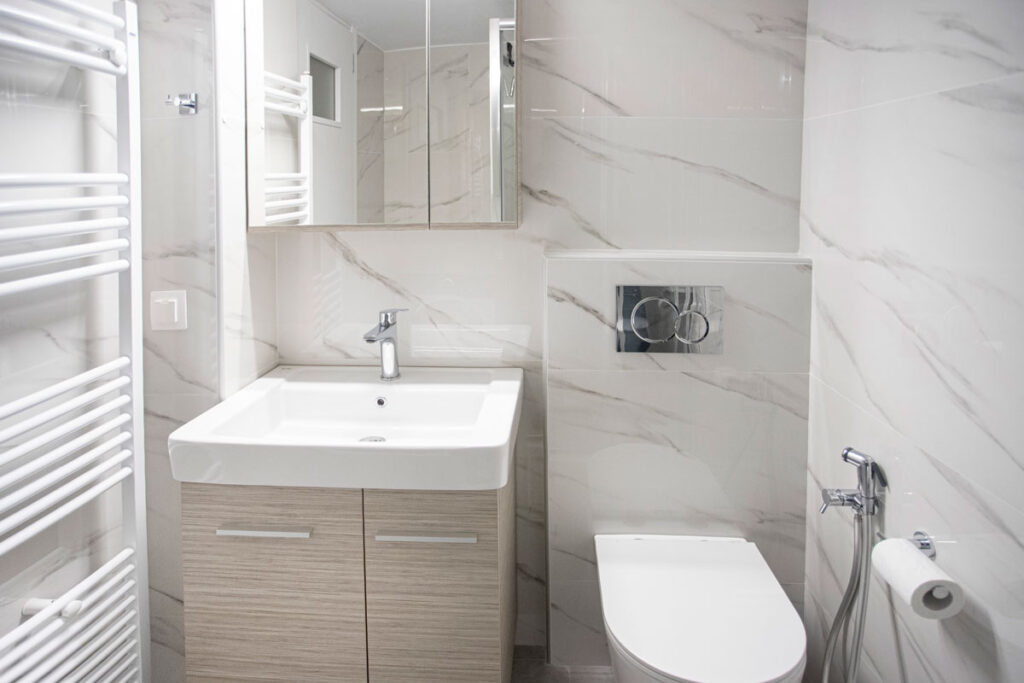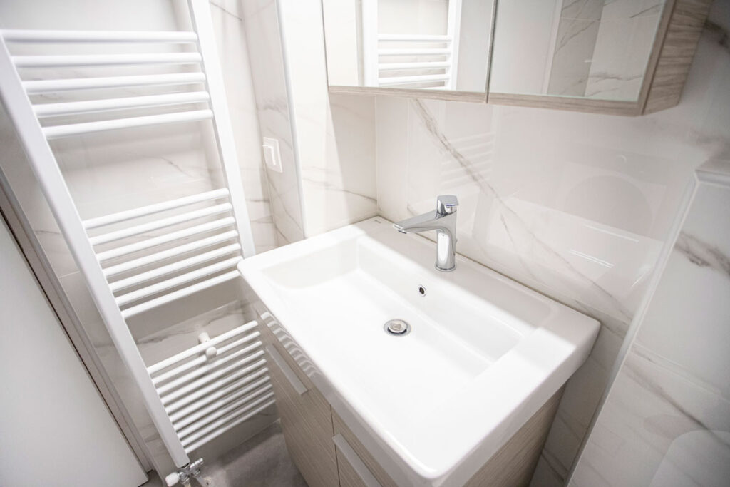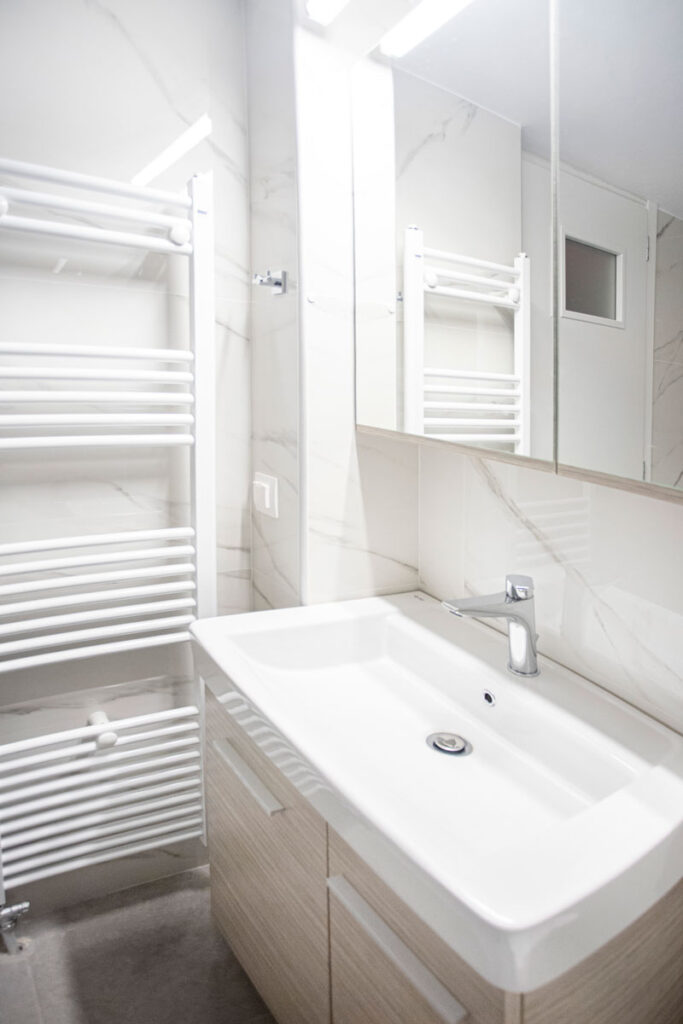 Ο μεγάλος καθρέφτης με αποθηκευτικό χώρο συμβάλλει τόσο στη λειτουργικότητα όσο και στην αίσθηση βάθους, ενώ το λευκό θερμαντικό σώμα ολοκληρώνει το σύγχρονο αποτέλεσμα.