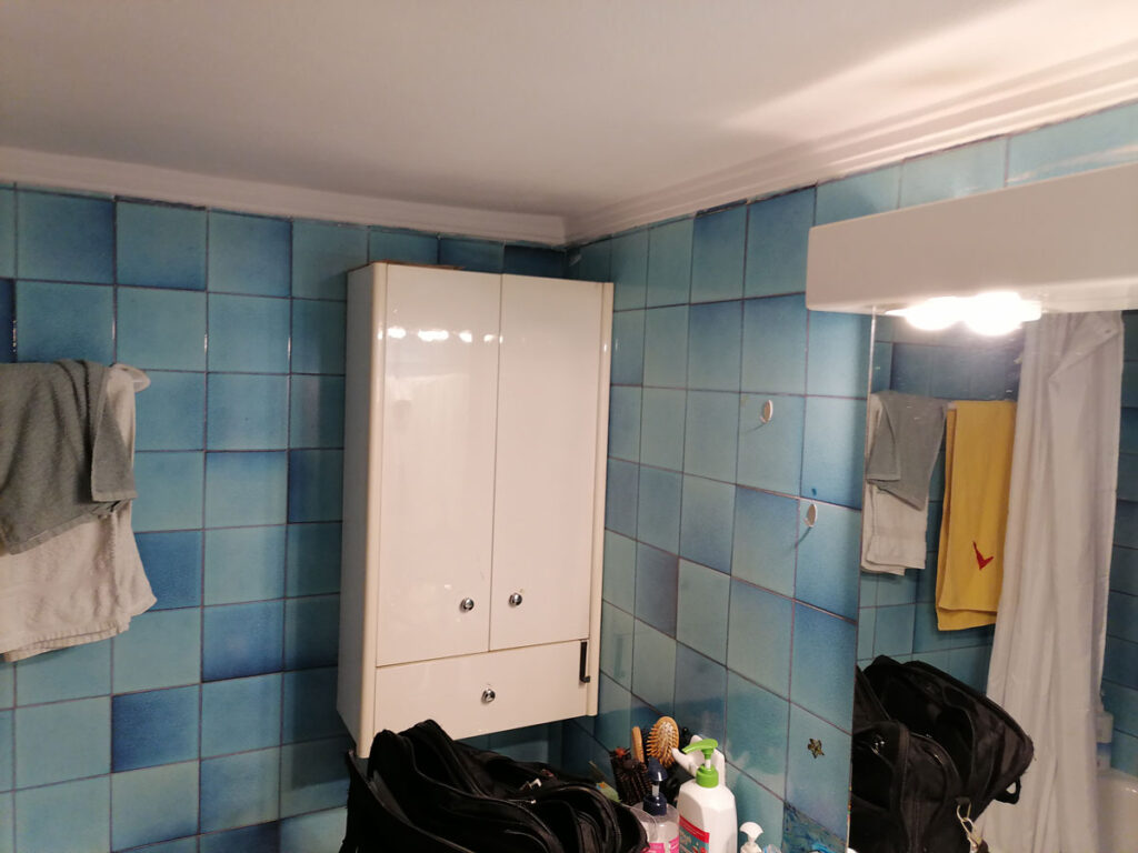Το μπάνιο πριν την ανακαίνιση στο Χαλάνδρι είχε παλαιά μπλε πλακάκια, περιορισμένη λειτουργικότητα και ξεπερασμένη αισθητική. Η διάταξη του χώρου δεν αξιοποιούσε σωστά τα διαθέσιμα τετραγωνικά, ενώ τα υλικά και ο εξοπλισμός είχαν φθαρεί με την πάροδο του χρόνου.
