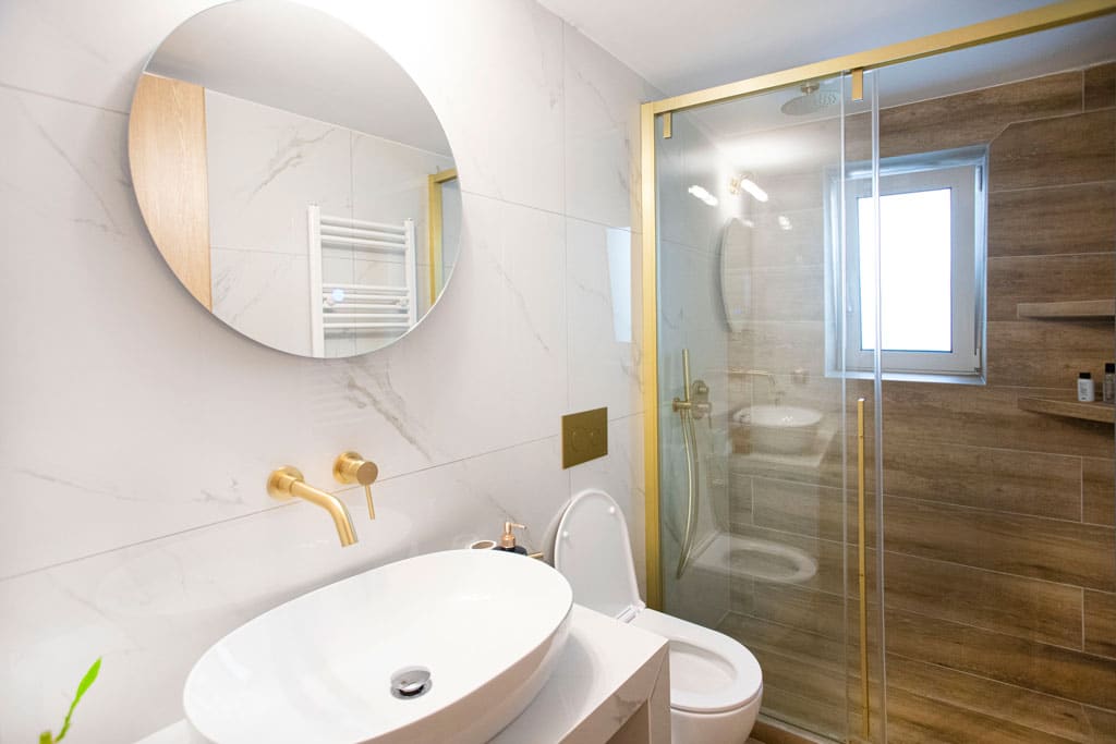 Η νέα διαρρύθμιση βελτίωσε σημαντικά την εργονομία, ενώ οι λεπτομέρειες — όπως οι χρυσές ματ μπαταρίες, ο στρογγυλός καθρέφτης με LED φωτισμό και η walk-in ντουζιέρα με γυάλινο διαχωριστικό — αναβαθμίζουν τη συνολική εμπειρία χρήσης.