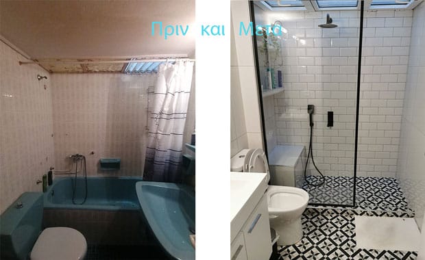 Το παλιό μπάνιο διέθετε μπανιέρα και παλαιά είδη υγιεινής σε μπλε απόχρωση, ενώ τα παλιά πλακάκια και η διάταξη του χώρου περιόριζαν σημαντικά τη λειτουργικότητα. Στο πλαίσιο της ανακαίνισης πραγματοποιήθηκε πλήρης αποξήλωση των παλαιών υλικών, αναβάθμιση των υδραυλικών εγκαταστάσεων και επανασχεδιασμός της διάταξης του μπάνιου.