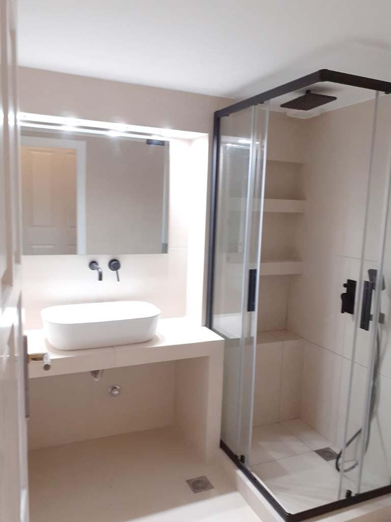 Στις παραπάνω εικόνες φαίνεται το αποτέλεσμα της ανακαίνισης μπάνιου στο Ίλιον, με σύγχρονη ντουζιέρα, minimal γραμμές και εργονομική αξιοποίηση του χώρου.