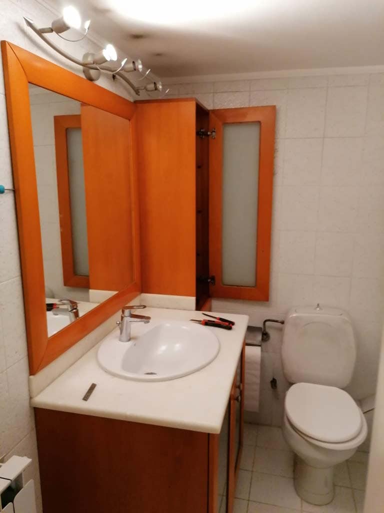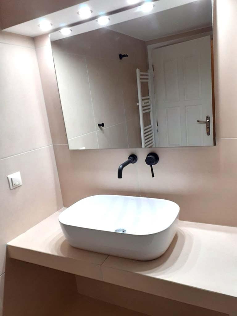 Ο νέος καθρέπτης, σε συνδυασμό με τον σωστό φωτισμό που τοποθετήθηκε από πάνω, αναβάθμισε σημαντικά τη συνολική αίσθηση του χώρου. Το μπάνιο δείχνει πλέον πιο φωτεινό, καθαρό και περιποιημένο, χωρίς να δημιουργείται αίσθηση «βαρύτητας» ή δυσφορίας. Παράλληλα, η κατασκευή πάγκου για την τοποθέτηση του νιπτήρα δημιούργησε επιπλέον αποθηκευτικό χώρο στο κάτω μέρος, ιδανικό είτε για την εγκατάσταση πλυντηρίου είτε για ντουλάπια αποθήκευσης.