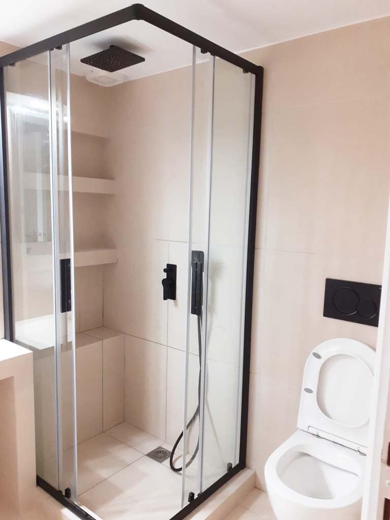 Η παλιά μπανιέρα αντικαταστάθηκε από μια σύγχρονη ντουζιέρα, επιτρέποντας την καλύτερη αξιοποίηση των διαθέσιμων τετραγωνικών και προσφέροντας μεγαλύτερη άνεση στην καθημερινή χρήση. Επιπλέον, τοποθετήθηκαν πρακτικά ράφια, ώστε τα προϊόντα περιποίησης, όπως σαμπουάν και αφρόλουτρα, να αποθηκεύονται οργανωμένα και διακριτικά, χωρίς να αλλοιώνεται η εικόνα του μπάνιου.