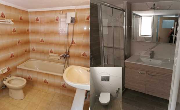 Το δάπεδο και τα πλακάκια στους τοίχους αλλάχτηκαν όλα, με γνώμονα τις προτιμήσεις και τα γούστα του πελάτη. Επιλέχθηκαν ουδέτερα χρώματα, αλλά και στυλ μάρμαρο, που αποπνέουν αίσθημα χαλάρωσης. Επιπλέον, έγιναν όλες οι απαραίτητες ηλεκτρολογικές μετατροπές, ενώ τοποθετήθηκαν μοντέρνα και χρήσιμα αξεσουάρ μπάνιου.