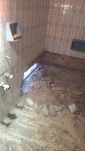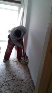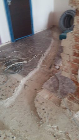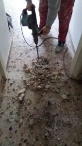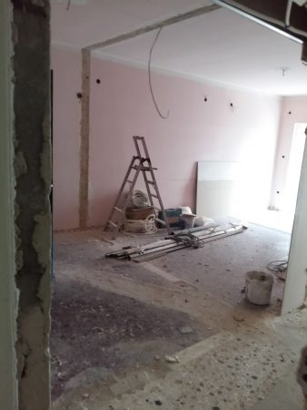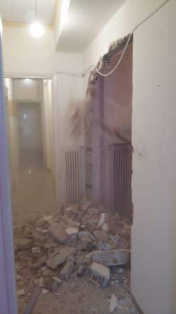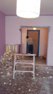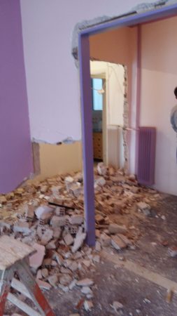 Στο μεγάλο μπάνιο γκρεμίσαμε το πατάρι γιατί ήταν άχρηστο γιατί ο κατασκευαστής είχε κάνει μια πόρτα 40εκ ύψος με αποτέλεσμα να μην χρησιμεύει σε κάτι το πατάρι στο μεγάλο μπάνιο. Αποξηλώσεις ειδών υγιεινής και πλακιδίων στα δυο λουτρά. Αποξηλώσεις ερμαρίων κουζίνας και δυο ντουλάπες καθώς και τις μεσόπορτες.