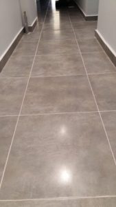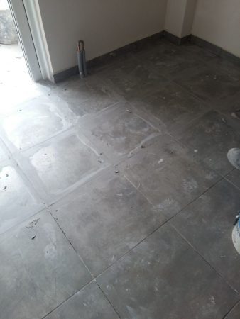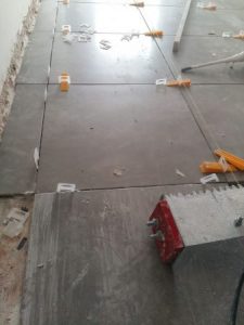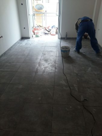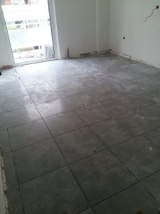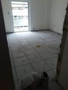 Αφού επιλέξαμε τα πλακάκια από τη μεγάλη γκάμα πλακιδίων ιταλικής και ισπανικής προέλευσης που διαθέτουμε στο γραφείο μας , προχωρήσαμε στην προμήθεια και τοποθέτηση πλακιδίων στα δάπεδα εσωτερικά του διαμερίσματος καθώς και στους εξώστες (βεράντες) αφού βέβαια προηγήθηκαν κάποιες προεργασίες στα μωσαϊκά για καλύτερη πρόσφυση της κόλας επάνω στο μωσαϊκό. Η τοποθέτηση των πλακιδίων έγινε με ιδικά σύστημα αλφαδοποίησης πλακιδίων για να αποφύγουμε τυχών ατέλειες στα πλακάκια του δαπέδου.